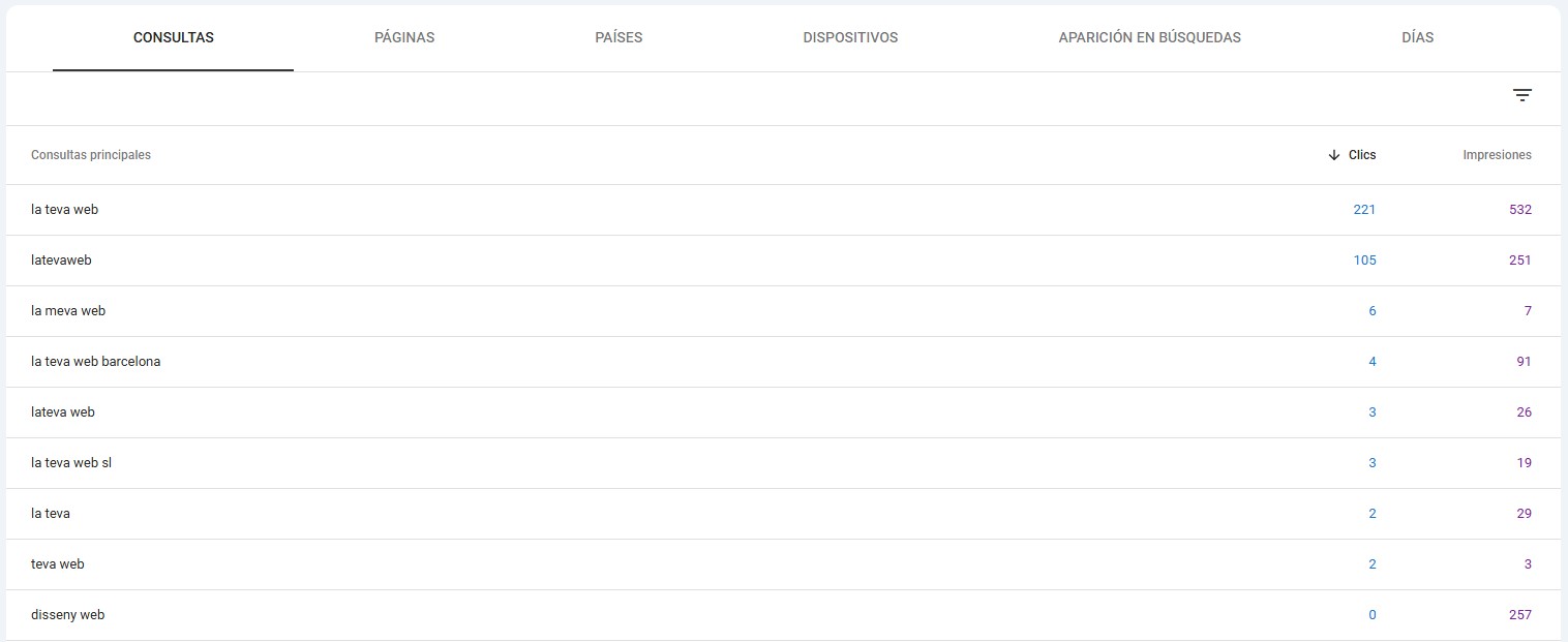 A la part inferior hi trobem la taula de consultes. Per defecte ens apareixen les consultes que aporten més trànsit SEO, però a partir d’aquí has d’anar navegant i jugant amb el sistema de filtres. Això et permetrà analitzar el rendiment de les paraules clau que ja tenies controlades, però també descobriràs oportunitats SEO inesperades. Fixa’t especialment en keywords amb moltes impressions però pocs clics: hi ha una oportunitat de mercat si millores la teva posició mitjana.