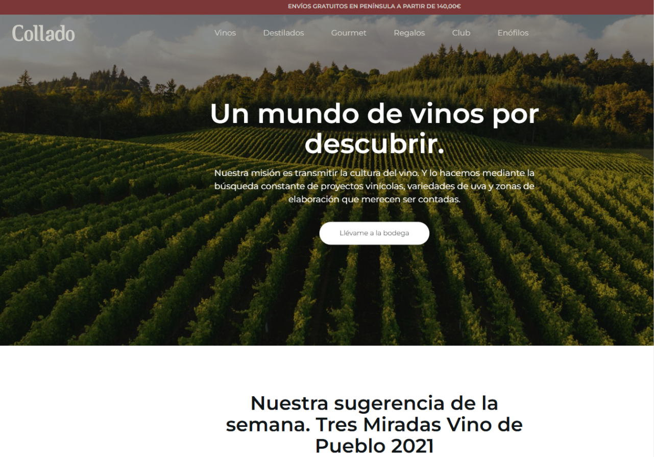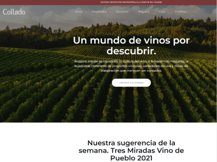 El diseño de la web es limpio, elegante y moderno, siguiendo un estilo premium que refleja la calidad de los vinos de Collado. Implementamos un buscador avanzado y un sistema de filtros para facilitar la búsqueda entre una amplia variedad de vinos y otros productos.